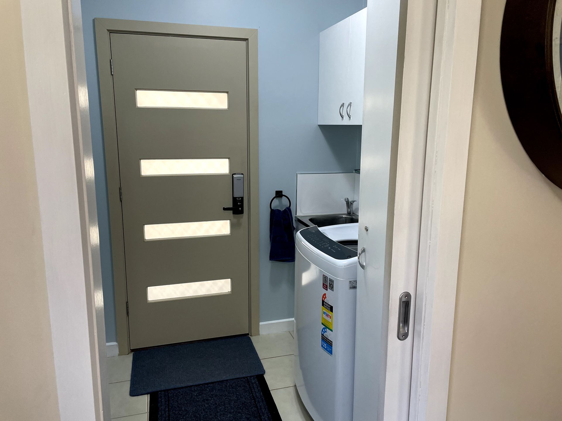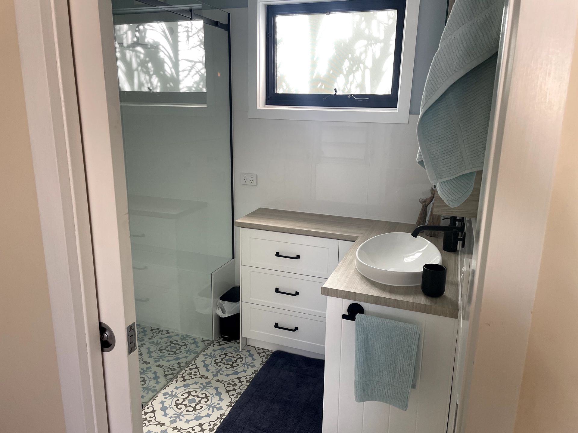 Guests share a modern bathroom equipped with essentials, extra towels, and a hairdryer. All linen is provided, and the property also offers a private entrance, ample on-site parking, and laundry facilities for longer stays.