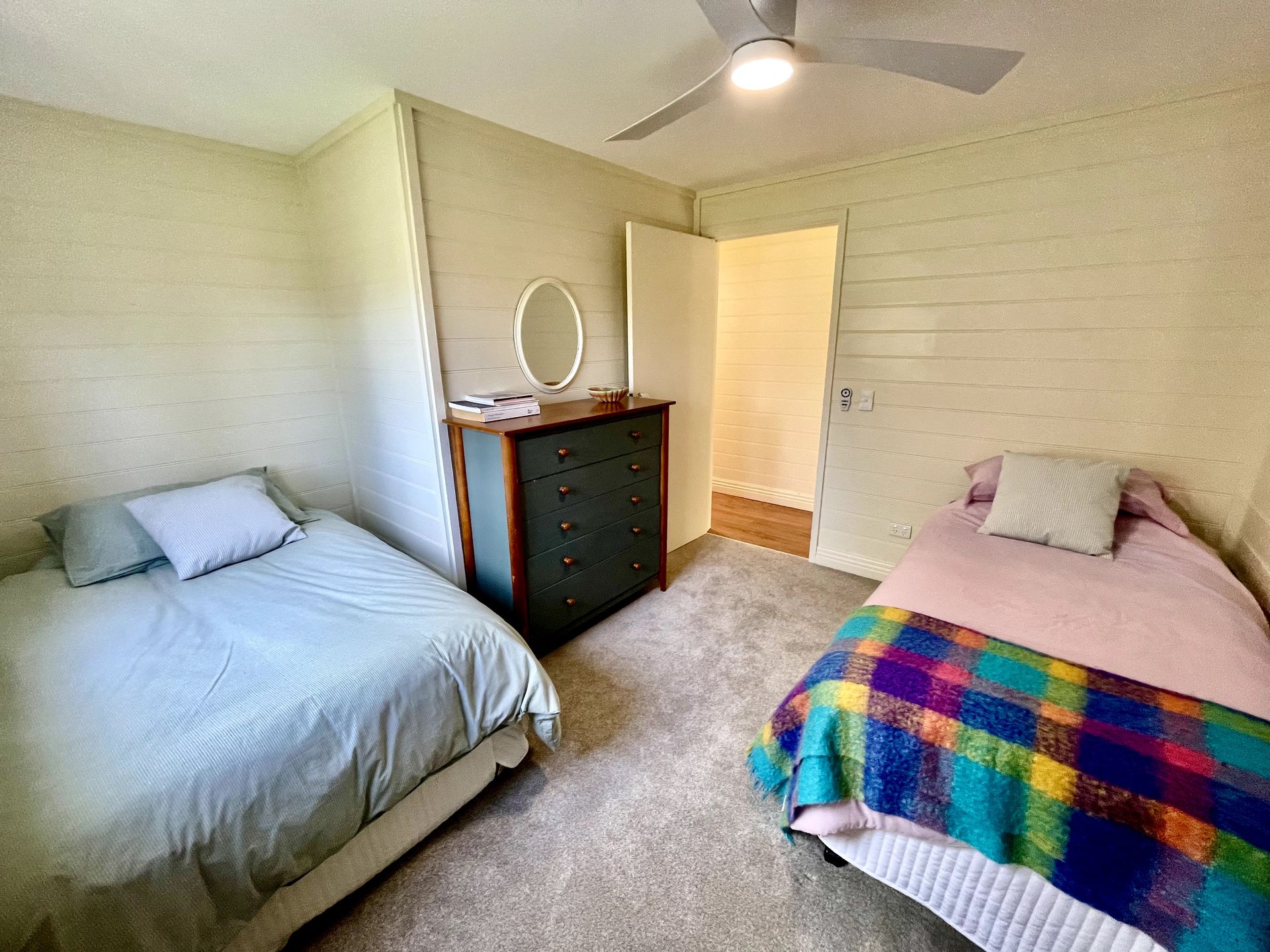 Presenting three beautifully designed bedrooms, each adorned with cozy furnishings to ensure a soothing stay. We offer two spacious bedrooms each complemented with a comfortable queen-sized bed while the third bedroom is equipped with two single beds (one is a king single), perfect for children or a group of friends. A port a cot is also available on request.